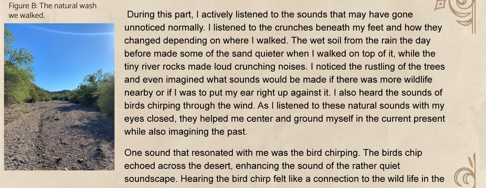 Engaging with Sentinel Peaks sounds shaped my understanding of what it is now: a place for people in the community to gather, reflect, discover, and spend time together. These every-day sounds—cars driving, bikes, conversations, music—are a symphony of history and community. These sounds intersect with the proposed sounds of the past, such as the o’odham settlers discussing their own lives or the soldiers discussing orders of the day.